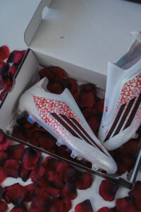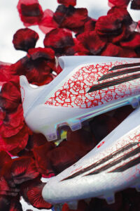Práve motív ruže sa stal hlavným prvkom dizajnu tejto edície. Čistý biely zvršok dopĺňajú výrazné červené grafiky rozkvitnutých ruží, ktoré vytvárajú kontrast medzi eleganciou a dravosťou. Výsledkom je vizuálne veľmi výrazná silueta, ktorá na ihrisku okamžite zaujme.